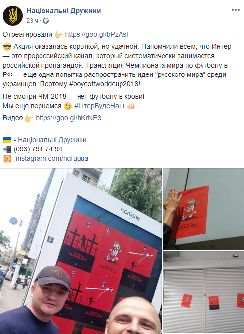 15:12  Нацдружины накануне подошли к зданию "Интера" и с криками "За Родину" наклеили на него несколько листовок против трансляции чемпионата.