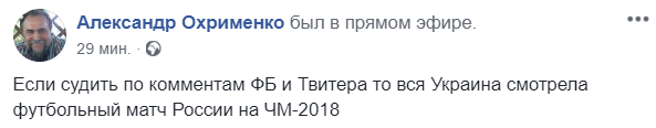20:30  "Если судить по комментам ФБ и Твитера то вся Украина смотрела футбольный матч России на ЧМ-2018", - пишет экономист Александр Охрименко.
