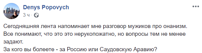 За кого вы болеете - за Россию или Саудовскую Аравию?", - пишет в Facebook журналист Денис Попович.