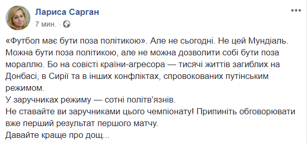 "Не становитесь вы заложниками этого чемпионата! Прекратите обсуждать уже первый результат первого матча", - написала в Facebook Лариса Сарган.