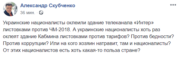 "А украинские националисты хоть раз оклеят здание Кабмина листовками против тарифов? Против бедности? Против коррупции? Или на кого хозяин натравит, там и националисты?", - удивляется блогер Александр Скубченко.
