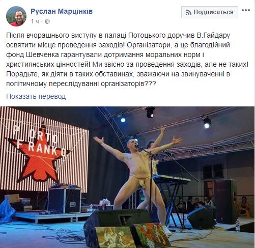 "После вчерашнего выступления в дворце Потоцкого поручил Гайдару освятить место проведения мероприятий! Организаторы, а это благотворительный фонд Шевченко (скорее всего, речь о фонд нардепа Александра Шевченко – Прим. Ред.) гарантировали соблюдение нравственных норм и христианских ценностей! Мы, конечно, за проведение мероприятий, но не таких! Посоветуйте, как действовать в таких обстоятельствах, несмотря на обвинении в политическом преследовании организаторов???", – написал Марцинкив.