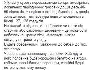 По словам синоптика, в Киеве в субботу будет преобладать солнце, "вероятность локальных периодических грозовых дождей порядка 40-50 процентов". В воскресенье в столице вероятность дождей увеличится. Температура воздуха выходные в Киеве 27-28 градусов, добавила она.