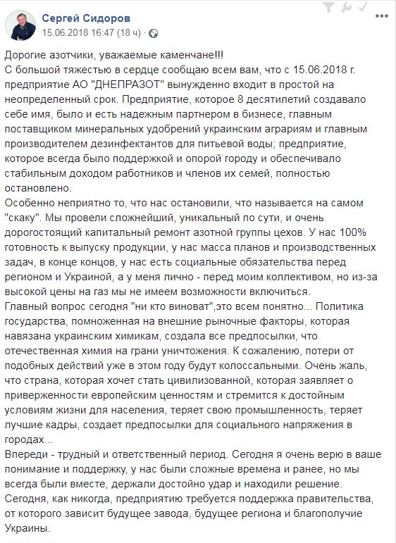 "С большой тяжестью в сердце сообщаю всем вам, что с 15.06.2018 г. предприятие АО "ДНЕПРАЗОТ" вынужденно входит в простой на неопределенный срок. Предприятие, которое 8 десятилетий создавало себе имя, было и есть надежным партнером в бизнесе, главным поставщиком минеральных удобрений украинским аграриям и главным производителем дезинфектантов для питьевой воды; предприятие, которое всегда было поддержкой и опорой городу и обеспечивало стабильным доходом работников и членов их семей, полностью остановлено", - говорится в сообщении.