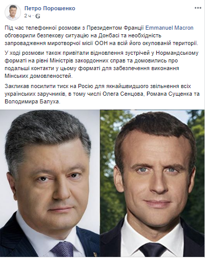 Также Петр Порошенко и Эммануэль Макрон приветствовали возобновление встреч в "нормандском формате" на уровне глав МИД и договорились про дальнейшие такие контакты.