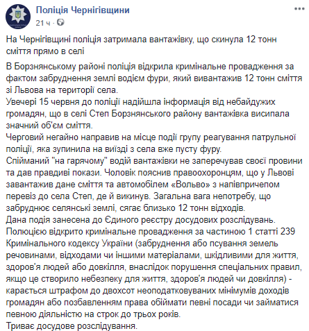 "Пойманный "на горячем" водитель грузовика не отрицал своей вины и дал правдивые показания. Мужчина объяснил правоохранителям, что во Львове загрузил данный мусор и автомобилем Volvo с полуприцепом перевез в село Степь, где и выбросил. Общий вес мусора, загрязняющего крестьянские земли, составляет около 12 тонн", – сказано в сообщении.