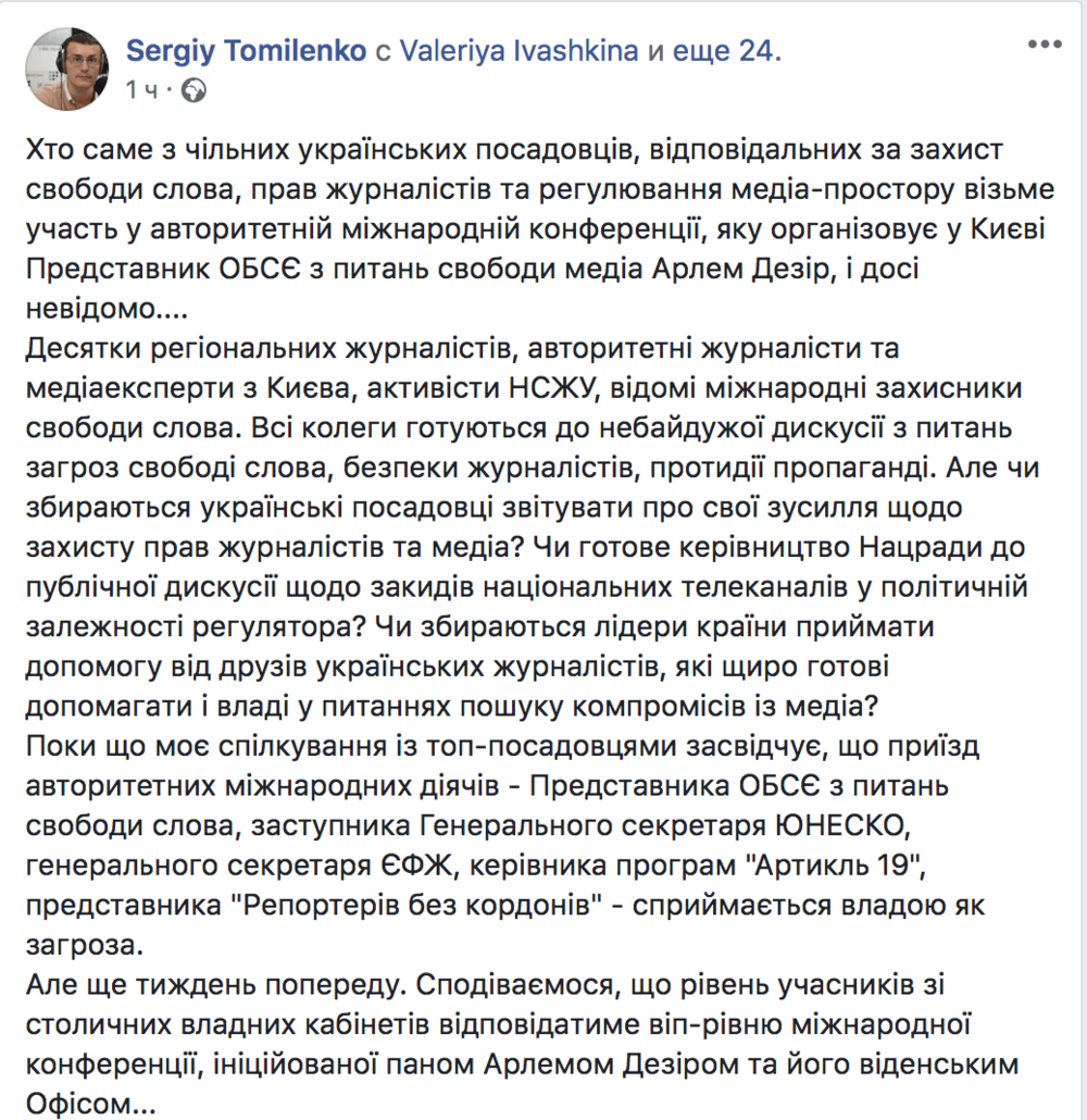 Глава НСЖУ Сергей Томиленко на своей странице в Facebook отметил, что уже десятки журналистов из разных регионов готовятся к дискуссии. Но пока неясно, собираются ли украинские чиновники отчитаться об усилиях по защите СМИ.
