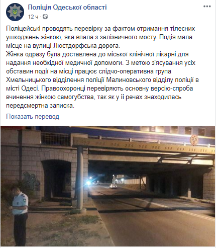 С железнодорожного моста на улице Люстдорфская дорога в Одессе спрыгнула женщина. Она была госпитализирована с телесными повреждениями в городскую клиническую больницу.