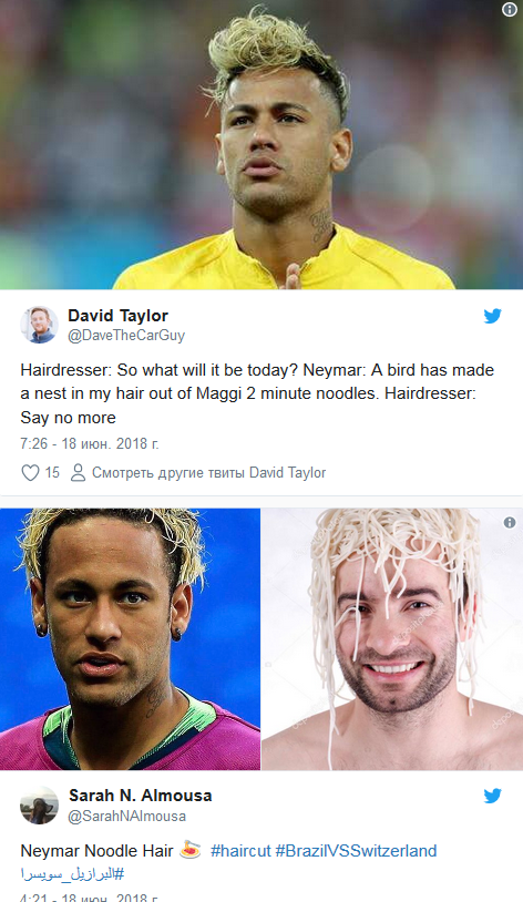 После неудачного матча сборной Бразилии против команды Швейцарии (1 - 1) на главную звезду "пенткампеонов" обрушился вал критики. Если Неймар чем и запомнился болельщикам, так это своей странной прической, которую по достоинству оценили пользователи соцсетей по всему миру.