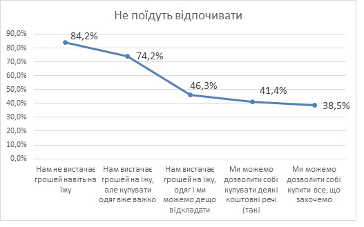 Отмечается, что количество тех, кто не поедет отдыхать, обратно пропорциональна уровню финансовой обеспеченности: чем ниже доход, тем больше тех, кто не поедет отдыхать и наоборот.