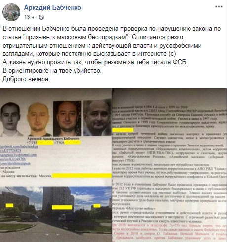 "Отличается резко отрицательным отношением к действующей власти и русофобскими взглядами, которые постоянно высказывает в интернете (с). А жизнь нужно прожить так, чтобы резюме за тебя писала ФСБ. В ориентировке на твое убийство", - написал журналист.