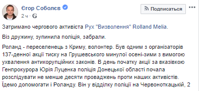 "Задержан очередной активист Руху "Визволення" Мелия Роланд. Он вез жену, остановила полиция, забрали.