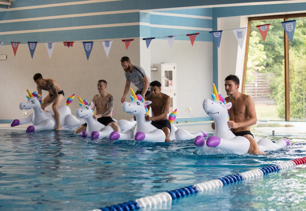 После победы над сборной Туниса (2 - 1) в своем стартовом матче чемпионата мира по футболу игроки сборной Англии неплохо расслабились в бассейне. На базу команды в Репино привезли надувных единорогов и футболисты устроили заплыв на фантастических зверях.