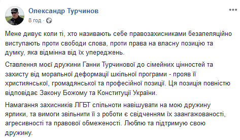 Попытки защитников ЛГБТ-сообщества навешивать на мою жену ярлыки и требования уволить ее с работы являются свидетельством их ангажированности, агрессивности и правовой ограниченности. Люблю и поддерживаю свою жену", – написал Александр Турчинов.