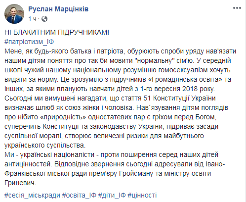 Мы - украинские националисты - против распространения среди наших детей антиценностей. Соответствующее обращение сегодня адресовали от Ивано-Франковского городского совета премьеру Гройсману и министру образования Гриневич", - отметил ивано-франковский городской голова.