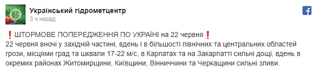 "22 июня ночью в западной части, днем и в большинстве северных и центральных областей, грозы, местами град и шквалы 17-22 м/с, в Карпатах и на Закарпатье сильные дожди, днем в отдельных районах Житомирской, Киевской, Винницкой и Черкасской областей сильные ливни", - говорится в сообщении.