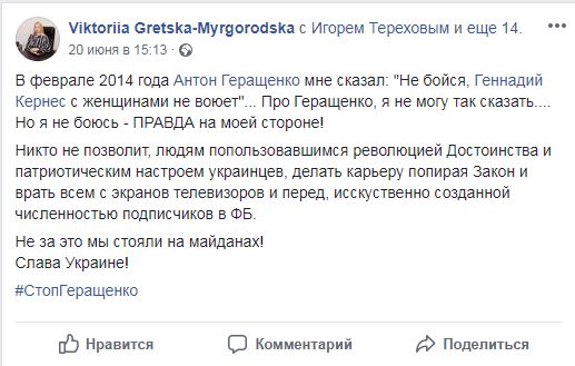 Также в еще одном сообщении она пишет, что "...если что-то случится со мной или моими близкими - это произойдет по заказу Антон Геращенко!".
