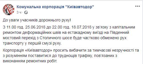 Об этом сообщили в пресс-службе "Киевавтодора" на своей странице в Facebook.