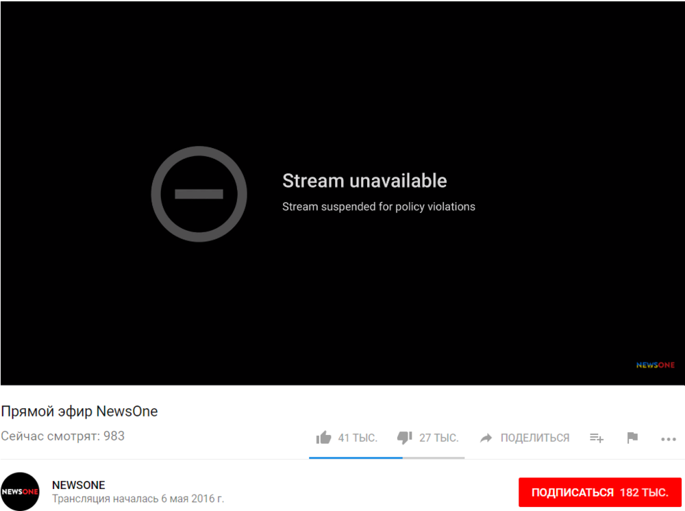 Странные вещи сегодня творятся и с каналом NewsOne, который недавно потребовали лишить лицензии - опять же за слова Мураева (собственник телеканала) о Сенцове. Прямой эфир канала в YouTube оказался заблокирован. Такое может быть при массовых жалобах на аккаунт, которые несложно организовать, объяснили "Стране" интернет-специалисты.