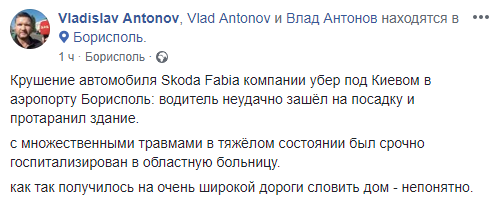 "Крушение автомобиля Skoda Fabia компании Uber под Киевом в аэропорту Борисполь: водитель неудачно зашел на посадку и протаранил здание",- написал Антонов.