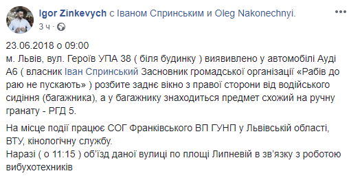 Зинкевич отметил, что машина принадлежит основателю общественной организации "Рабів до раю не пускають" Ивану Спринскому.