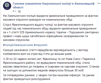 "Следователи Ярмолинецкого отдела полиции по факту массового отравления людей во время поминального обеда открыли уголовное производство по ч.1 статьи 325 Уголовного кодекса Украины – "Нарушение санитарных правил и норм по предотвращению инфекционных заболеваний и массовых отравлений", - говорится в сообщении полиции.