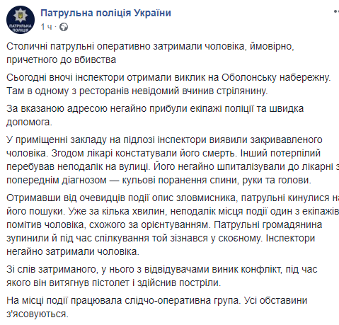Киевская полиция задержала хозяина кафе на Оболонской набережной, подозреваемого в убийстве. Об этом сообщает пресс-служба столичной полиции в Facebook.