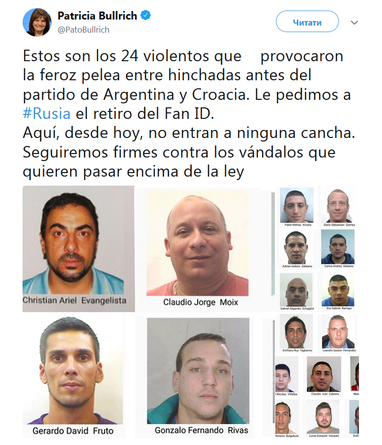 Она опубликовала фотографии 24 аргентинцев, которые, по ее данным, "спровоцировали ожесточенную драку между болельщиками перед матчем между Аргентиной и Хорватией".