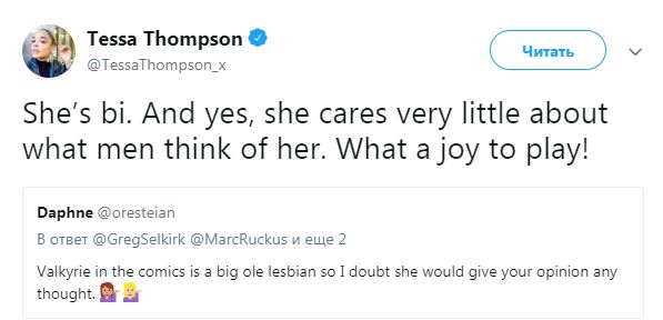 До этого звезда фильма "Тор: Рагнарек" Тесса Томпсон, сыгравшая Валькирию, отметила, что ее героиня в этой картине – квир. "Она би. И да, ее не волнует, что о ней думают мужчины. Какая радость — играть ее!" – написала актриса в Twitter.