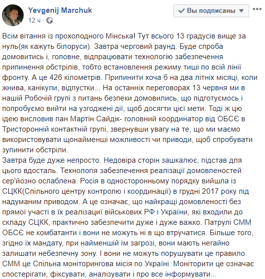 "Будет попытка договориться про установление режима тишины по всей линии фронта. А это 426 километров. Прекратить хотя бы на два летних месяца, когда жатва, каникулы, отпуска", - написал Марчук.