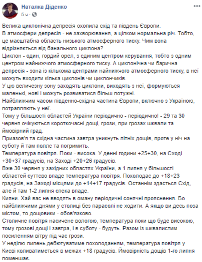 "У атмосферы депрессия - не заболевание, а вполне нормально. То есть, это масштабная область низкого атмосферного давления. Чем она отличается от банального циклона? Циклон - один, гордый орел, с единым центром управления, то есть с одним центром низкого атмосферного давления. А циклоническая или барическая депрессия - зона с несколькими центрами низкого атмосферного давления, в нее могут входить несколько циклонов или циклончиков. В эту огромную зону заходят циклоны, выходят из нее, формируются маленькие, новые и могут развиваться более мощные. В ближайшее время юго-восточная часть Европы, включая Украину, попадают в нее. Поэтому в большинстве областей Украины периодически - 29 и 30 июня ожидаются кратковременные дожди, грозы, при грозах шквалы и вероятный град", - пишет Диденко.