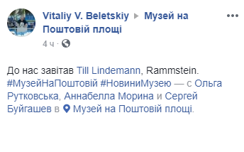 "К нам приехал Линдеманн, Rammstein", - написал Белецкий на странице "Музей на Почтовой площади" и выложил фото с музыкантом. С какой именно целью музыкант прибыл в Киев, пока неизвестно.
