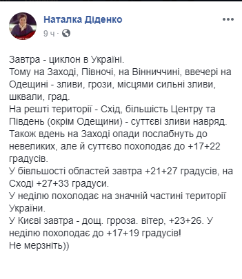В большинстве областей завтра + 21... + 27 градусов, на Востоке + 27... + 33 градуса. В воскресенье похолодает на значительной части территории Украины. В Киеве завтра - дождь, гроза. ветер, + 23 + 26. В воскресенье похолодает до + 17 ...+ 19 градусов!", - написала она