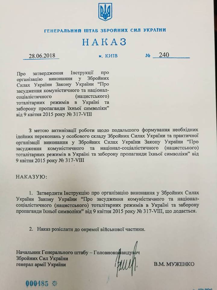 Глава Генштаба ВСУ Виктор Муженко подписал приказ, регламентирующий выполнение командирами всех уровней управления выполнения закона об осуждении коммунистического и национал-социалистического (нацистского) тоталитарных режимов в Украине и запрете их символики.