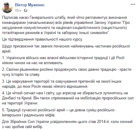 "О присвоении так называемых почетных наименований частям российской армии. Украинская армия имеет собственные военно-исторические традиции и действия России никоим образом на нас не влияют. Своими решениями россияне продолжают свою давнюю традицию - воровать чужую историю и славу. Это маркировка территории и озвучивание претензий на земли других народов, к которым Россия не имеет никакого отношения", - написал на своей странице в Facebook Муженко.