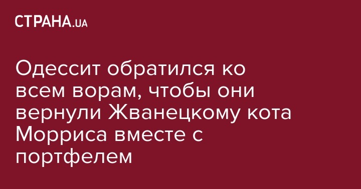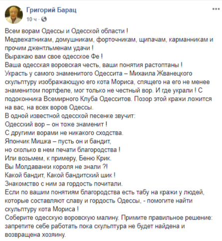 "Ваша одесская воровская честь, ваши понятия растоптаны! Украсть у самого знаменитого Одессита – Михаила Жванецкого скульптуру изображающую его кота Морриса, спящего на его не менее знаменитом портфеле, мог только не честный вор. И где украли! С подоконника Всемирного Клуба Одесситов. Позор этой кражи ложится на вас, на всех воров Одессы", - написал он.