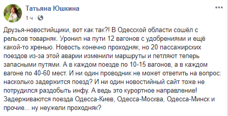 "В Одессе пассажиров с билетами на промежуточные станции тупо выкинули из поездов без объяснений и вариантов решения вопроса как им добраться? В Германии в таком случае автобусы запускают и пассажиров доставляют. Я позвонила на ЖД, где на мой вопрос будут ли автобусы мне ответили - нет, конечно", - написала в Facebook Мария Зубкова.