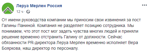 Руководство компании "Леруа Мерлен" (сеть строительных супермаркетов) в России приняло решение временно отстранить PR-директора Галину Панину после ее поста в соцсетях. Об этом сообщает пресс-служба компании на странице Facebook.