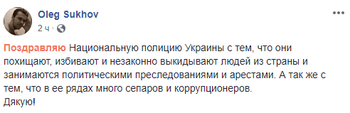 "Поздравляю Национальную полицию Украины с тем, что они похищают, избивают и незаконно выкидывают людей из страны и занимаются политическими преследованиями и арестами. А также с тем, что в ее рядах много сепаров и коррупционеров.