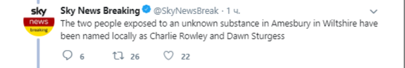 Состояние двух отравленных людей в городе поблизости Солсбери, где ранее отравили Скрипелей, остается критическим, однако новых потерпевших нет. Об этом сообщает Sky News в Twitter.