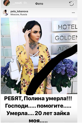 Она опубликовала в историях две фотографии сестры с эмоциональными комментариями, посвященными ее смерти. Через некоторое время Василиса Лобанова записала обращение к подписчикам, воспринявшим эту новость как розыгрыш.