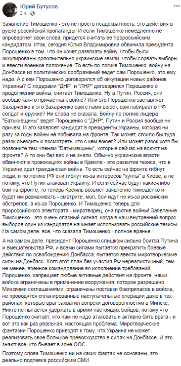 А вот журналист Юрий Бутусов считает, что никакого военного сценария Порошенко не готовит - он "сильно боится Путина" и лелеет "миротворческие фантазии". А Юлию Тимошенко он обвиняет в "российских тезисах".