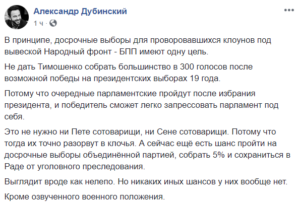 "В принципе, досрочные выборы для проворовавшихся клоунов под вывеской Народный фронт - БПП имеют одну цель.