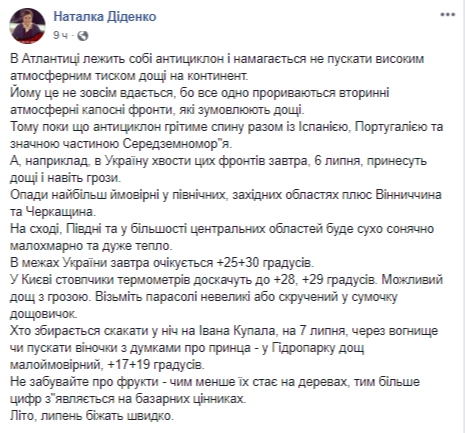 Синоптик Наталья Диденко рассказала о погоде  в пятницу, 6 июля накануне дня Ивана Купала, что в Атлантике лежит себе антициклон и пытается не пускать высоким атмосферным давлением дожди на континент, это и обеспечивает ясную погоду,  но все равно прорываются вторичные атмосферные фронта, которые обусловливают дожди.