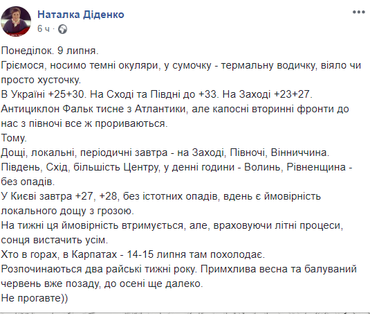 "Греемся, носим темные очки, в сумочку - термальную водичку, веер или просто платок. В Украине +25...+30. На Востоке и Юге до +33. На Западе +23... +27. Дожди, локальные, периодические завтра - на Западе, Севере, в Винницкой области. Юг, Восток, большинство центральных регионов, в дневные часы - Волынь, Ровенская - без осадков", - прогнозирует она.