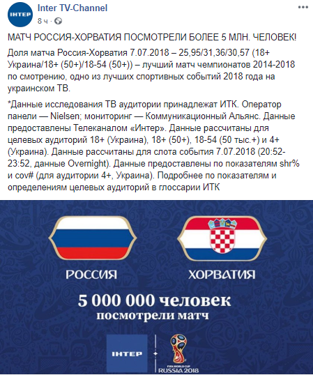 Доля матча Россия-Хорватия 7 июля составила 25,95/31,36/30,57 (18+ Украина/18+ (50+)/18-54 (50+)) – таковы данные исследования телевизионной аудитории.
