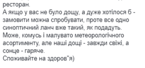 "Между прочим. Если я часто, как, возможно, кому-то кажется, говорю про вероятность дождя с грозой, то не потому, что мне словосочетание "дождьсгрозой" нравится. Так часто, как говорю, так и подают в прогностическом профессиональном метеоменю", - уточнила Диденко.