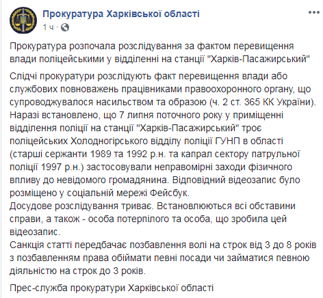 "Установлено, что 7 июля в помещении отделения полиции на станции "Харьков-Пассажирский" трое полицейских Холодногорского отдела полиции ГУ НП в области (старшие сержанты 1989 и 1992 г.р. и капрал сектора патрульной полиции 1997 г.р.) применяли неправомерные меры физического воздействия к неизвестному гражданину. Соответствующая видеозапись была размещена в социальной сети Фейсбук", - сообщает пресс-служба прокуратуры Харьковской области в понедельник, 9 июля.