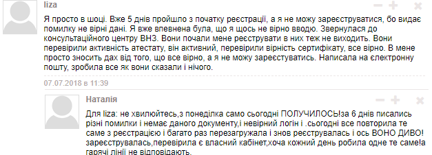Не обходится без проблем при регистрации электронных кабинетов. На сайте Освiта.ua абитуриенты жалуются, что у кого-то не получается внести данные - постоянно появляется запрос о повторной регистрации, кого-то не нашли в Единой базе данных гражданина Украины или при попытке войти в кабинет появляется сообщение об ошибке. Также поступающие жалуются, что для связи указана почта ez@inforesurs.gov.ua (технический администратор системы) и единственный телефон (044) 290-18-13, дозвониться на который сложно. Некоторые делятся опытом, что приходится звонить по нескольку раз, чтобы дождаться связи с оператором.