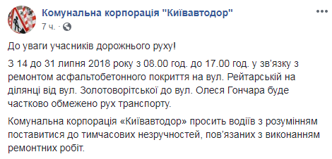 С 08:00 до 17:00 (с 14 по 31 июля) в Киеве, по улице Рейтарской, а также - между улицей Золотоворотской до улицы Олеся Гончара будет частично ограничено движение транспорта. На участках проведут ремонт асфальтобетонного покрытия. Об этом сообщили в КК "Киевавтодор".